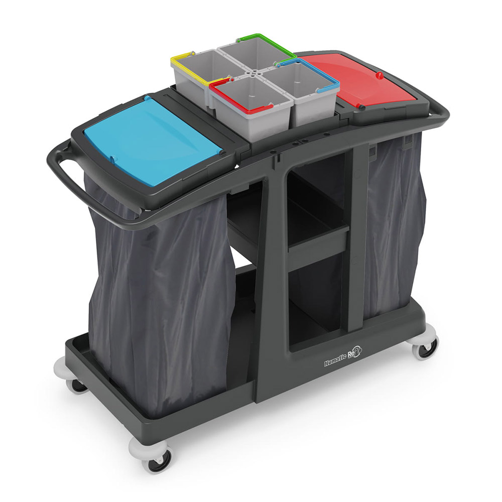 Duży wózek EM4 SRK21 angielskiej marki NUMATIC przeznaczony jest do segregacji odpadów na małych i średnich powierzchniach. Wyposażony jest w 2 uchwyty z pokrywą na worki 120L lub 2x70L. Wózek doskonale sprawdza się w niewielkich pomieszczeniach o ograniczonej dostępności np. w wąskich korytarzach w szpitalach czy szkołach.
