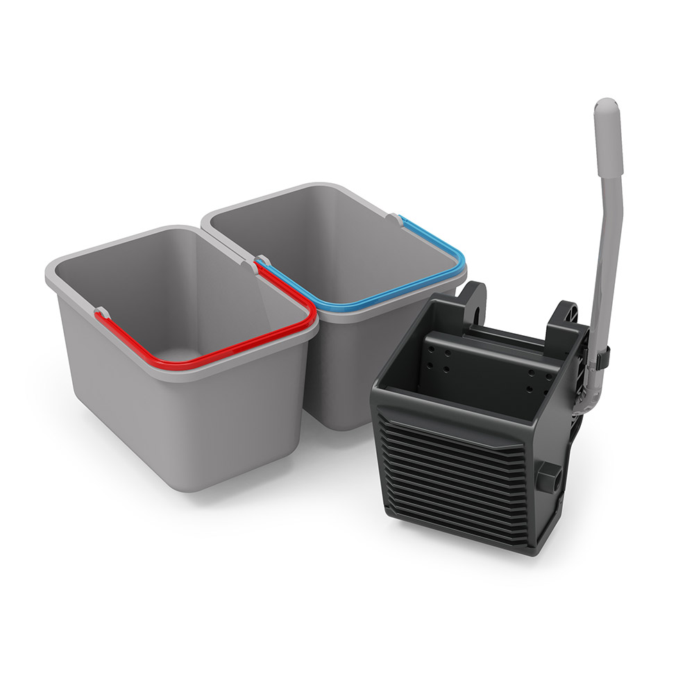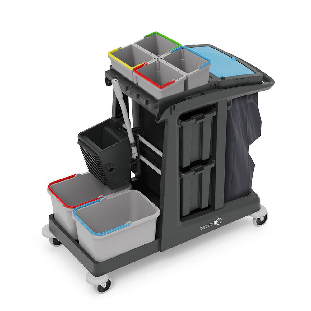Wózek do sprzątania Numatic EM5 SRK16 typu full-service oferuje zestaw 2-wiadrowy z wyciskarką doczołową do mycia podłóg, wysuwane kuwety, obszerny kosz na śmieci z pokrywą na worek o pojemności 120 litrów oraz zestaw małych podręcznych wiaderek. Przedni pokład można również wykorzystać do umieszczenia innego zestawu 2-wiadrowego lub np. odkurzacza.