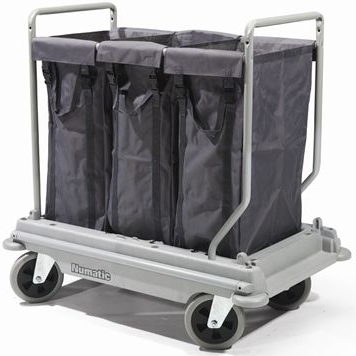 Wielofunkcyjny wózek hotelowy na pościel. Zbudowany na solidnej i sztywnej platformie z dwoma kołami skrętnymi dla maksymalnej zwrotności. Gumowane kola na łożyskach kulkowych/ślizgowych zapewniaja ciche przemieszczanie. Został wyposażony w trzy wyjmowalne worki o pojemności 100L, ułatwiające transport pościeli. Wózek można powiększyć o dwa dodatkowe worki na składanych stelażach (2xSBA100) powiększające pojemność wózka do 500L.